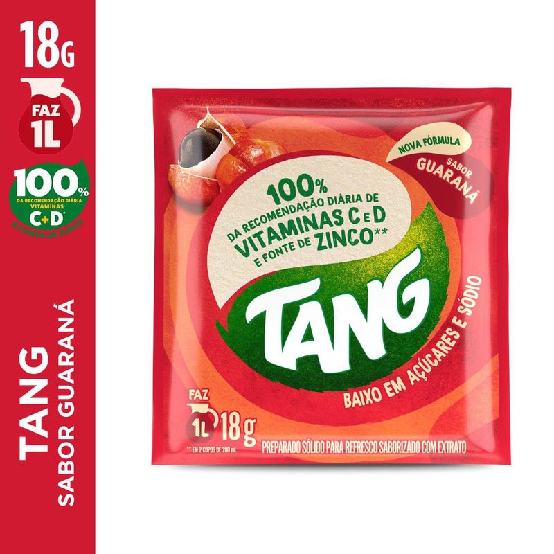 Chegou o novo Tang, com 100% da dose diária de vitamina C e D que o seu filho precisa e ainda é fonte de Zinco. A nova fórmula tem 18g e rende 1L, qualidade e praticidade que deixam o dia a dia mais delicioso. Prepare seu filho para mudar o mundo com Tang Guaraná.